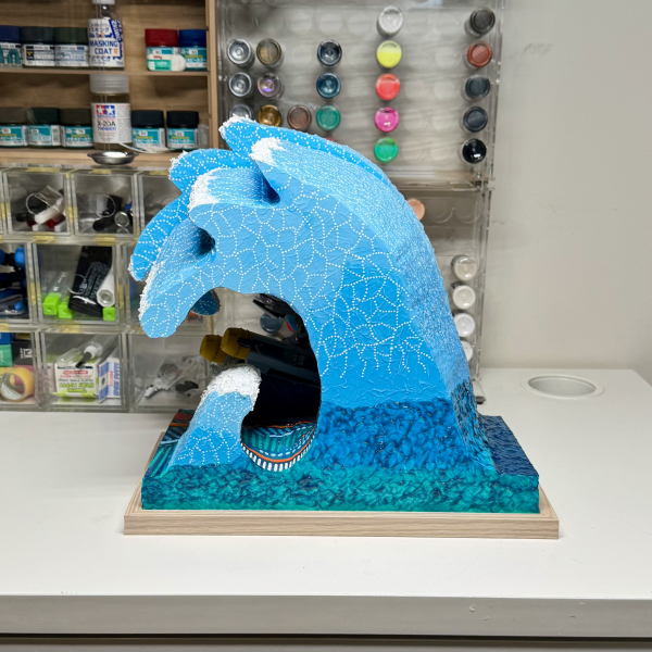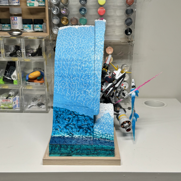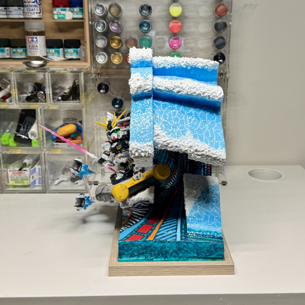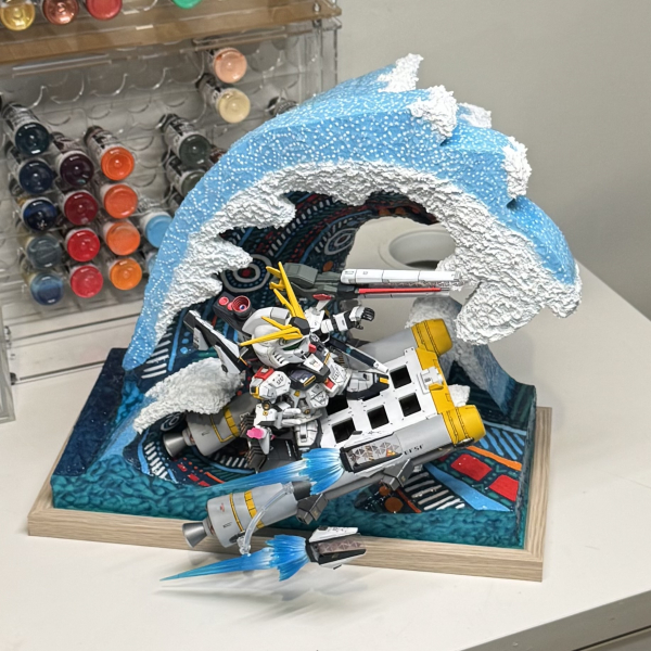 This work is titled Bondi. It features the RX-93 Nu Gundam surfing the powerful waves at Bondi Beach, one of the most famous and iconic beaches in Sydney. The inspiration comes from the world-renowned artwork The Great Wave off Kanagawa. The RX-93 Nu Gundam itself was fully customized. It is finished with hand-painted and airbrush techniques, including shading, highlighting, and metallic gradients to achieve depth and realism. Panel lining and weathering were applied to give the mobile suit a battle-worn appearance, emphasizing the intensity of the fight. The action pose was chosen to reflect both the spirit of surfing and the strength of the Gundam. The diorama was entirely scratch-built. The wave was sculpted from layered foam and epoxy putty, then carefully shaped to convey energy, motion, and the raw power of the ocean. It was hand-painted and airbrushed with gradient blues, white highlights, and detailed dry-brushing to replicate the foamy spray. The inclusion of mechanical textures within the water creates the impression of a living, mechanical ocean, reinforcing the theme of nature colliding with technology. This piece represents the fusion of nature, culture, and Gundam pop culture, blending them together into a striking and memorable display.