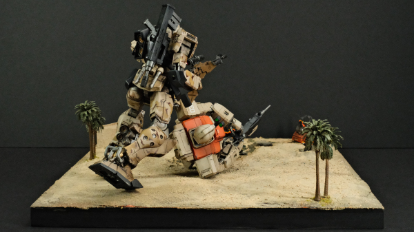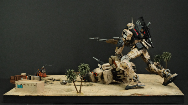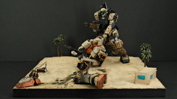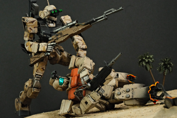 'The Ambush' shows a special forces mobile suit pulling a 'grunt' GM from an ambush. The GM has had its legs blown off and the GM Sniper is desperately attempting to drag him out of harm's way. I wanted to show the first seconds of the action and contrast the difference between the two units. To represent the elite special forces mobile suit, the GM Sniper II is heavily customised with: Scratch built NVG visor, made from plasticard + parts from MS Sight Lens and a MG Gouf custom kit. Custom Front and rear waist armour, adapted from a HG Demi Trainer. Custom Elbow guards from a Demi Trainer Heavily customised legs, with rocket guard removal and panel remodelling. Customised ankle suspension, removal of guards and custom Demi Trainer ankle guards. Removal of stock exhaust and replacement with slimmer Gundova boosters. Front custom panel remodelling for a more elite look. Customised marksmen rifle from the original GM Sniper II kit, modified to house a flashlight. Customised bullpup with suppressor mounted on the back. Custom panel scribing Camo paint For the 'Grunt' RGM 79 (G) Scratch built NVGs, but deliberately less high tech than the GM Sniper to represent his 'grunt' status: Front panel remodelling. Custom Scribing Destruction of the legs with rebuilt internal damage, made from various modelling materials Decals from Bandai Zeta & 00 decal sets. I used modelling clay + texture paint/pigments for the base board. I textured the ground to show the drag marks and impact craters. The oil/coolant was then painted in. The house was scratch built from cardboard, toothpicks and plasticard. Cotton wool was painted for smoke, and architectural model trees were painted and added to round of the scene. I wanted the scene to look interesting from every angle including the top, so I designed it to have lots of fine detail for every view. I hope the more the viewer spends time with it the more detail they will see!