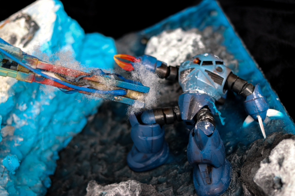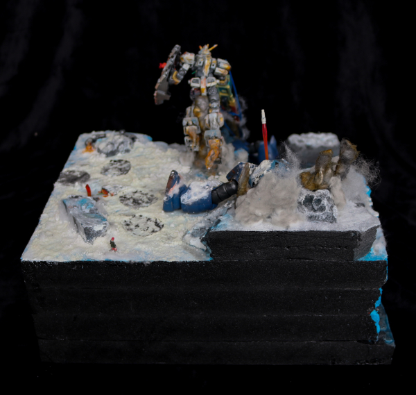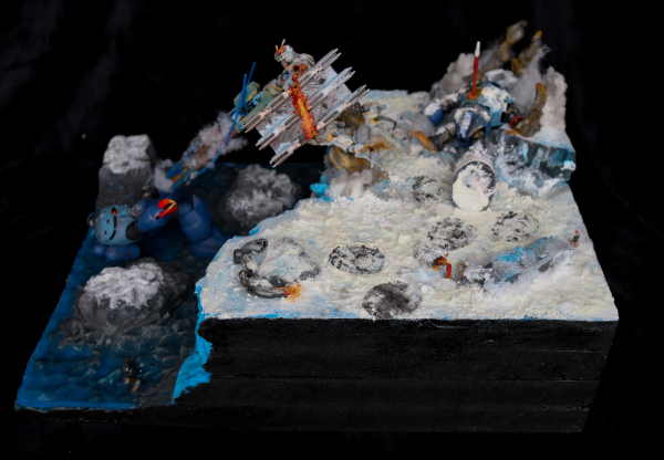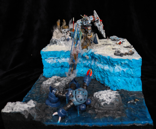 The model is a diorama of an Antarctic cliff side battle between the Atlas Gundam and Zgoks. The base, cliffs and rocks on the diorama are made up of XPS Foam cut into shape and painted using an airbrush. The water effects on the diorama have been made using Vallejo Still Water Effects and coloured with transparent blue paint. Snow has been made using NOCH Snow effects and a homemade snow. Cotton and snow have been used to portray smoke and airborne snow. The Atlas has been posed up in the centre of the diorama on a clear plastic rod hidden using painted cotton and stuffing. Collapsing foam rocks have been held up using thin brass rods. Foam rocks have been placed around the diorama both in the water and on the cliff. The Atlas Gundam and Zgoks have been painted using an airbrush and weathered with multiple coloured paints and molten metal had been portrayed in cut sections of the model painted in red orange and yellow. A Zgok has been laid down up on the cliff with the Atlas Gundams beam saber in its chest. The second Zgok had been posed in the water partially coated in Vallejo water effects pointing its arm out towards the Atlas Gundam. The Atlas Gundam is posed holding a damaged and weathered shield and railgun. The railgun has been coloured in red yellow and blue to portray heat. Lightning parts have been designed using beam sabers and clear plastic parts heated into shape. The Atlas Gundam rifle and mechanical arm have been cut and posed around the rocks on top of the cliff. They have been hand painted. A pilot figure of Bianca Carlyle has been hand painted and made from junk Bandai Pilot figure spare parts.