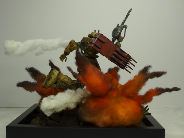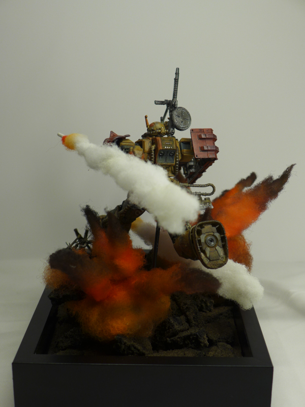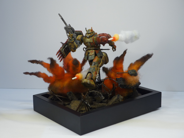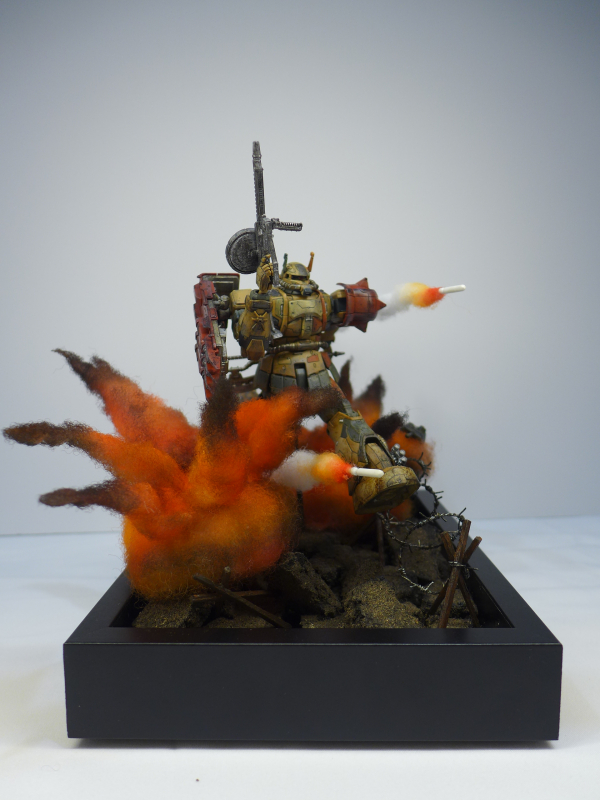 My concept is a soldier in the middle of war, retreating from heavy fire on the battlefield. I lightly airbrushed and dry brushed the Gundam to give it a dirty appearance, emphasizing a war-like theme. The Gundam was scribed and panel-lined. I wrapped a wire around the Gundam's arm to represent a missile that had missed its target. The missile was made from plastic, which I filed and shaped to resemble a missile. To simulate a smoke trail, I used cotton attached to the missile's ends and painted it in a gradient of yellow, orange, and red to create an explosive or firing effect. The wires and cotton were attached using glue diluted with water. I also tried to blend the wires into the cotton by airbrushing them white to make them less visible. For the terrain, I used a large piece of torn cork trivet table mat to create a deformed landscape. I glued dirt and placed rocks between the gaps of the cork and around the edges of the diorama to make it look more natural. The base was constructed using foam. The explosions were made with cotton dipped in orange, then painted with yellow and red. The tips of the explosions were shaped using metal wires to give them form and simulate a blast effect. I also included a broken tank, which I spray painted and dry brushed with a layer of brown to match the battlefield theme. The toy tank used in the diorama is also in 1/144 scale.