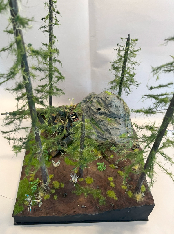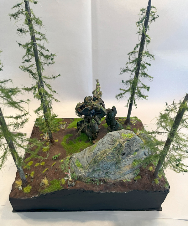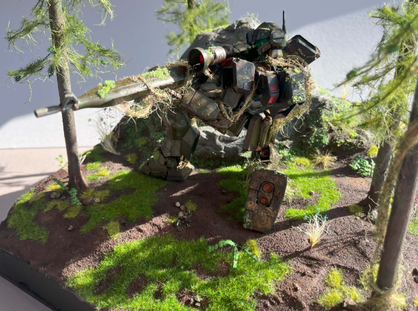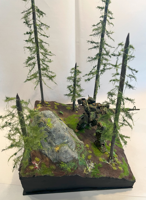 I have created a diorama depicting an old remnant of Earth Federation forces where the pilot has been killed by one decisive beam strike, leaving the mobile suit immobilised in place. The passage of time has allowed nature to reclaim the mobile suit. I began creating the base by gluing XPC foam together and shaping the landscape. Using plaster, I carved a large rock to go behind the mobile suit. The rock and landscape are made from plaster. I glued various grades of coarse grit, semolina & modelling sand to create a realistic forest floor texture. The rock was painted, given washes, and dry brushed. Various washes give more depth and texture to the floor, and the rock is detailed with moss. I drilled a hole through the rock that lined up with a planned pose for my kit and then detailed it to look like a melted hole. The trees were made from carved dowels and wire leaves made from various fibres. Handmade static grass tufts and static grass are featured on the ground, with rocks and pebbles. I made flowering trees, and ferns are made from wire, paint, glue and plaster. For the kit, I painted the inner frame a gunmetal gray, and the armour plating is green & turquoise. I detailed various parts of the kit like the verniers, the eye sensor, and the sniper rifle. A hole was drilled through the cockpit to coordinate with the hole in the rock, which I painted. After a gloss coat, I applied decals around the kit and then scratched the decals and around its body. The weathering is done with rust effects around the exposed inner frame and then heavy chip weathering around the edges of the mobile suit. I applied various washes and acrylic effects, complimented with streaking grime. After a third topcoat I started doing texture weathering, adding coarse grit and paint detail, then various pigments to achieve a dirt texture. A matte topcoat was applied over the kit to create the desired sheen and seal. Over this I applied moss and vines made from twine and glued on foliage.