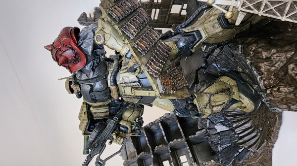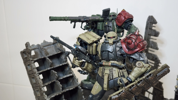 The Zaku kits are very well design. With full of military style details that I only needed to do panel line wash, coating with spray cans, weathering with Gundam marker and weathering powder, and added battle scar with dry brushing. Then awesome looking Zakus were done. For the base, was the un- colour version, so I hand paint it. That base matches the Zakus perfectly. I very happy with the finish result.
