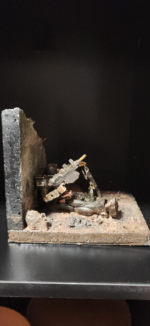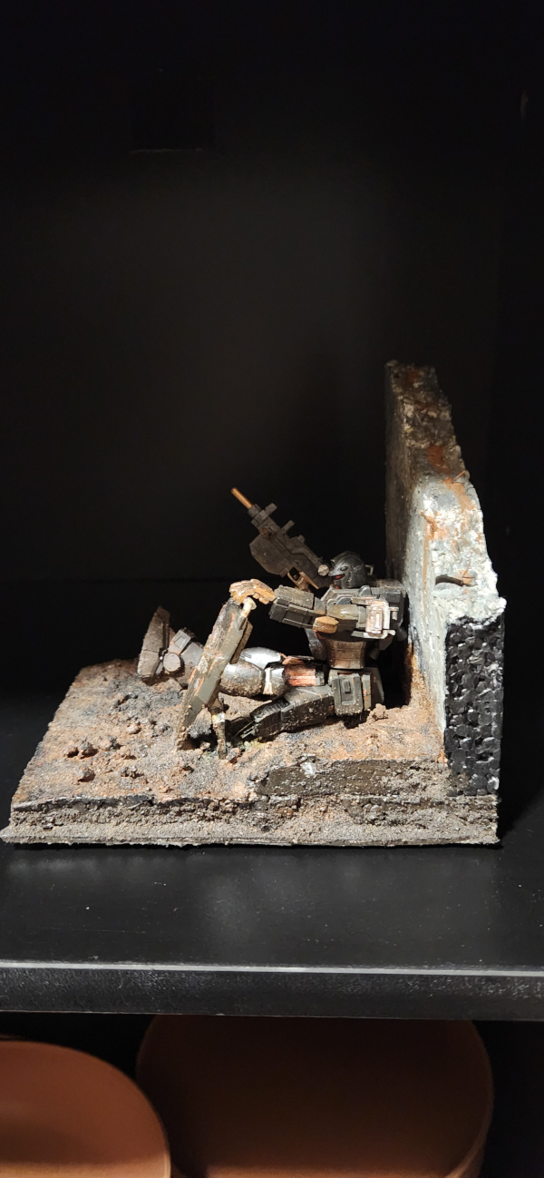 My piece depicts the Gundam RX-78-01 in a muddy battlefield, while it has sustained battle damage, it still continues to fight the war it is in. Persevering through the damage.