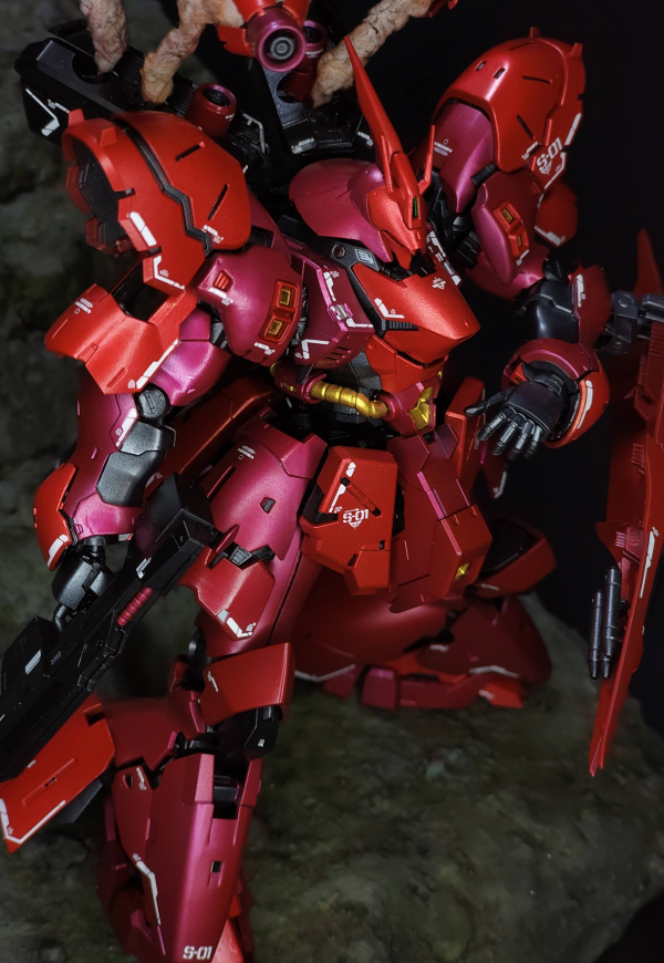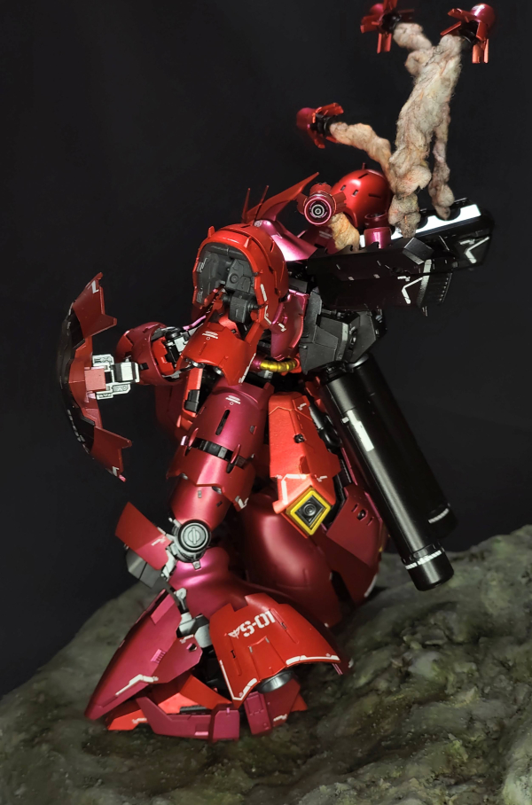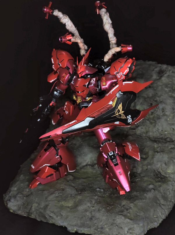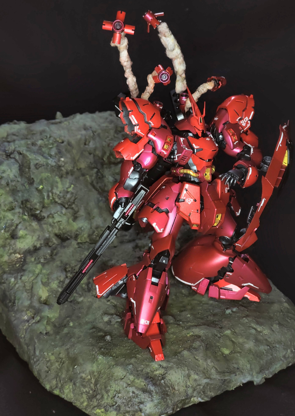 This is a diorama of the MSN-04 Sazabi on the edge of the Axis. The model kit is airbrushed with acrylic paint, the funnels are held up by wire and cotton, and the diorama base is made of XPS foam, Acrylic Craft Paint, Plaster of Paris and sand. The suit stood solitary. The endless battle it had fought felt like it was long lost. It had defended against the constant attacks sent by the Earth Federation. All this fighting was for the Axis, and the nuclear winter that Char wanted to create, but now, it merely felt as if he were fighting to survive. Maybe, just maybe, this wasn't such a good idea... but he didn't have time to think about failure. Right now, he needs to fight with all he's got!