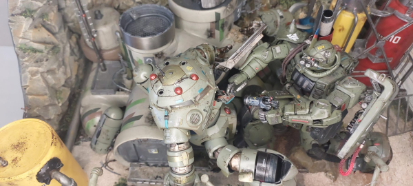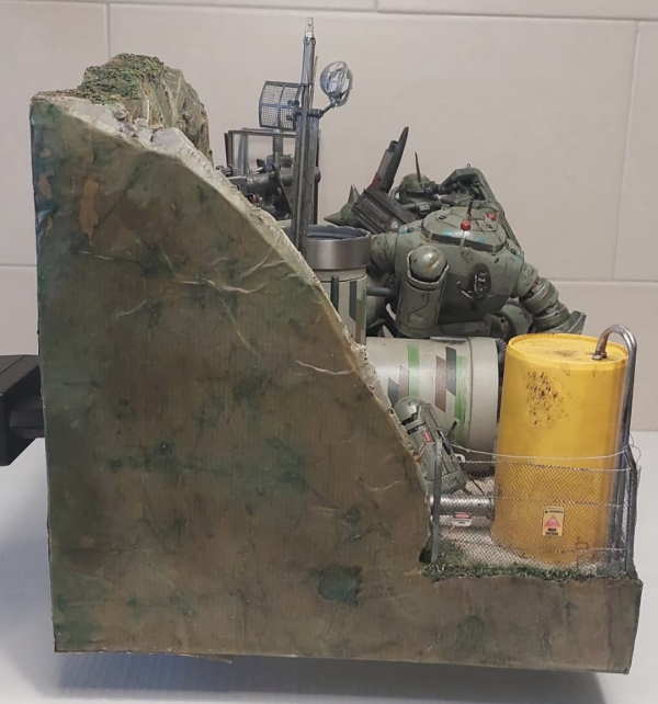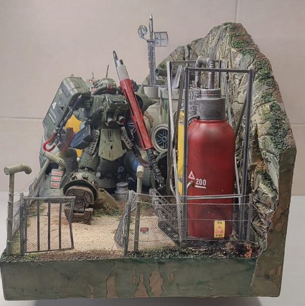 Questo diorama cattura un momento di intensa azione e tensione: l'MS-Z’Gok è ritratto dopo essere stato gravemente danneggiato in battaglia, mentre l'MS-06S Zaku II è in una fase di caccia meticolosa per trovare il pilota del nemico abbattuto. Soggetti e Dettagli Aggiunti I due Mobile Suit sono stati significativamente arricchiti con dettagli auto-costruiti per aumentarne il realismo. MS-06S Zaku II: È stato modificato con l'aggiunta di scudi e rinforzi fatti a mano, oltre a un fucile personalizzato e un sistema di visore notturno. MS-Z’Gok: Presenta danni estesi da battaglia con texture e colorazioni che simulano ustioni e lacerazioni metalliche, enfatizzando la violenza dello scontro. L'ambientazione è una base/deposito realizzato interamente con materiali di recupero e auto-costruiti. Struttura Base: Il terreno e le pareti sono in polistirolo scolpito per creare texture rocciose Dettagli Tecnici: Le tubature e i serbatoi sono realizzati con tubi idraulici di recupero, cannucce e barattoli di plastica modificati, conferendo all'ambiente un aspetto verosimile e ricco di elementi scenici. Integrazione Elettrica L'intera scena è valorizzata da un impianto elettrico a LED integrato. Le luci sono posizionate strategicamente per: Illuminare i Mobile Suit e l'area di ricerca dello Zaku. Simulare allarmi e effetti di malfunzionamento per i danni subiti, aumentando il dramma visivo della scena. Il diorama non è solo una rappresentazione statica, ma un tentativo di raccontare una storia di caccia e sopravvivenza attraverso l'uso sapiente del dettaglio artigianale e degli effetti luminosi.