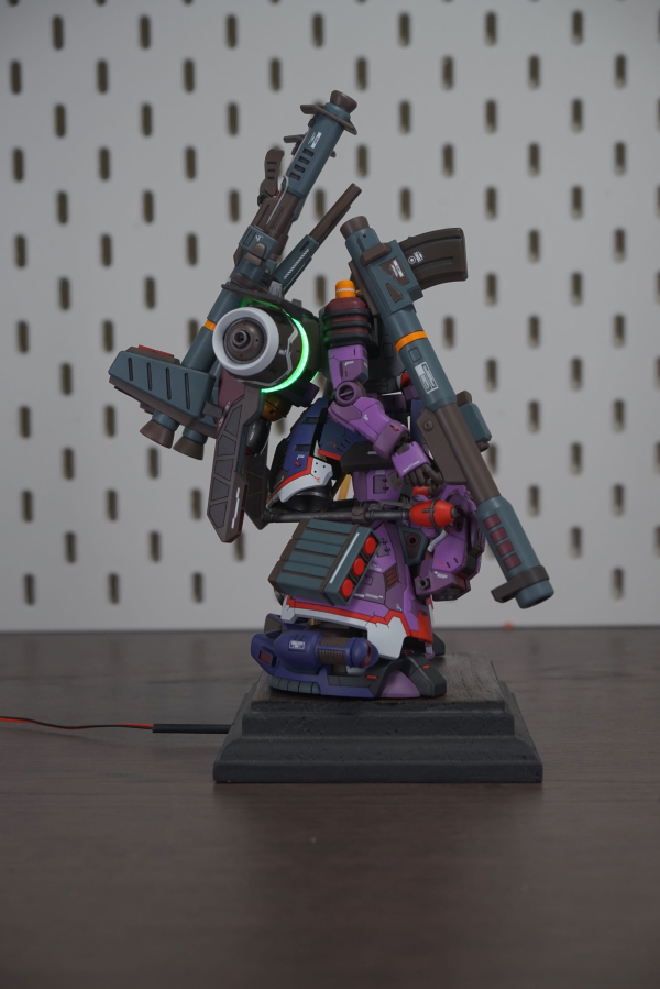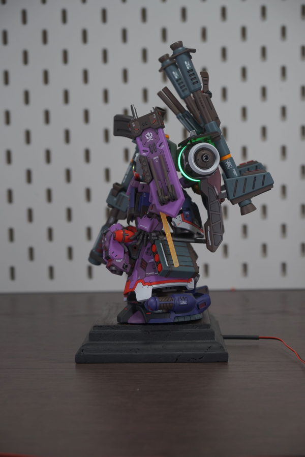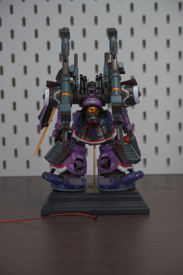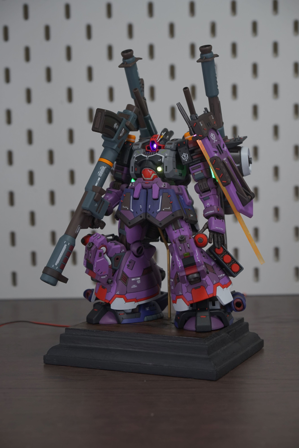 I kitbashed the dom tropen hg with the zudah using demi barding parts to blend the two together. i applied filling, carving, plaplating and scribing to create the features on the body parts. for example the vent parts are all carved by hand and are still the original dom tropen legs etc. i also updated the frame parts of the legs with modern joints from the demi barding. to complete the model i added leds to the demi barding backpack to signify the power thats kept within the pods. the backpack uses the flawed jupiter engine from the zudah but with the added parts i like to imagine i stabilized the output of the engine with the backpack from the mobile haro. A dom is also never complete without its monoeye or scattering beam cannon so i added an LED there too aswell as its heatrod. adding the armaments from the kampfer delivers a very striking silhouette, much like the psycho zaku i tried to apply the "psycho" treatment to this build, further signified by the amount of decals.