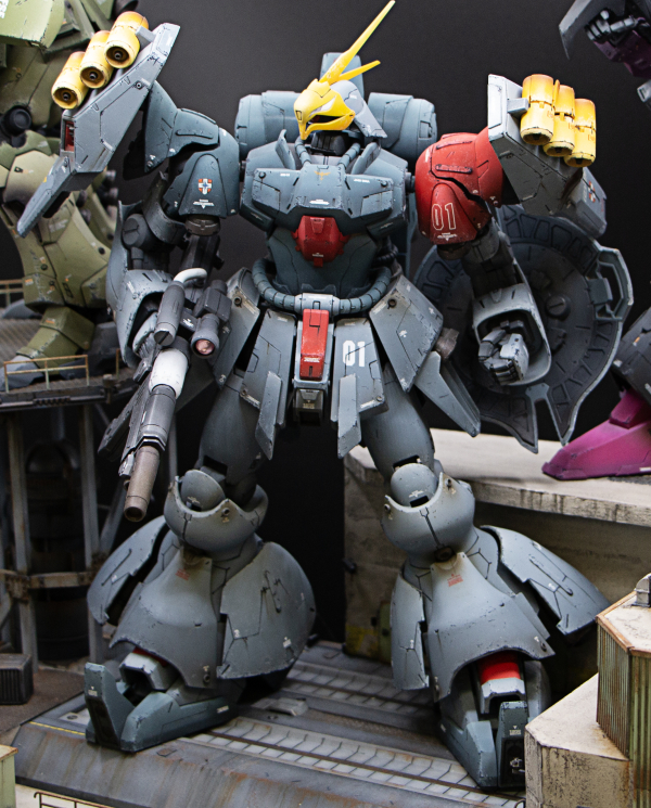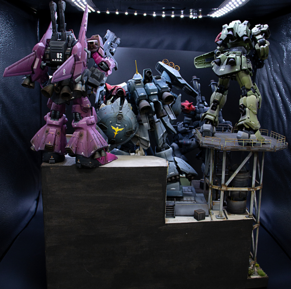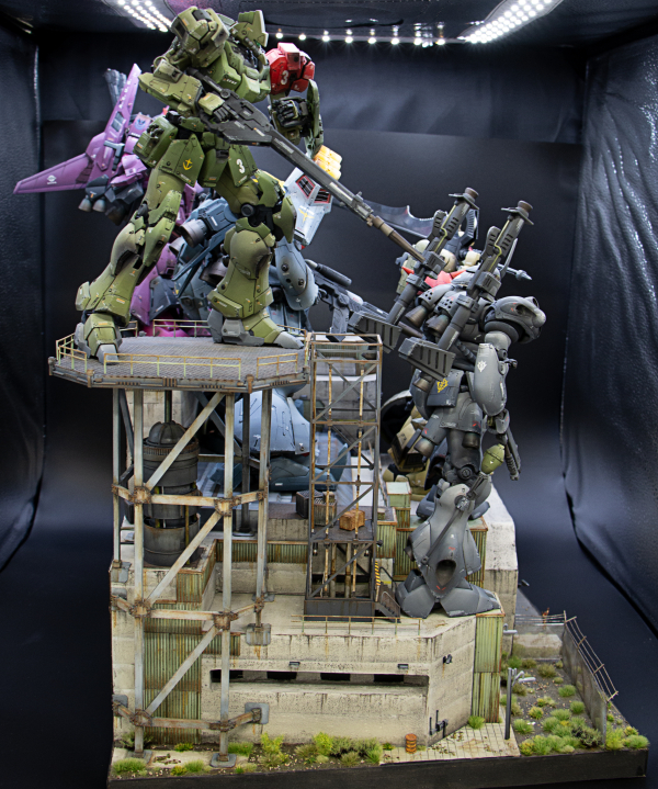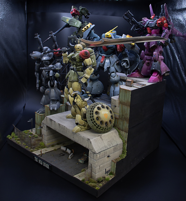 The project includes five custom mobile suits, created through kitbashing and modifications of various models. Jagd Doga was created using the RE/100 kit, adding parts from the GP02 MG, the Sinanju Stein, and other Gunpla kits. The backpack has an original design and was created using parts from various Gunpla kits. Rick Dias was built using the Rick Dias MG kit with the ReZel Commander Type backpack and parts from other Gunpla kits. Galbaldy Beta was built using parts from the Galbaldy Beta NG kit, released around the time of Zeta Gundam, on a Jesta-Sinanju hybrid frame. Kampfer was built using the armor from the Kampfer MG kit on the frame of the Sinanju Stein. Sinanju was built using a Sinanju Stein to which the head of a Sinanju from Full Frontal and the Gyan spike were applied. The arms, skirts, and shield are from the Gyan MG kit. All models were colored using color modulation and weathered also using Real Touch Gundam Markers. base is fully scratchbuilt, figures are from the 1/100 Bandai builder parts HD MS Figure set.