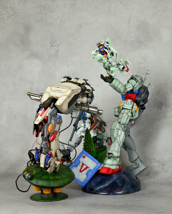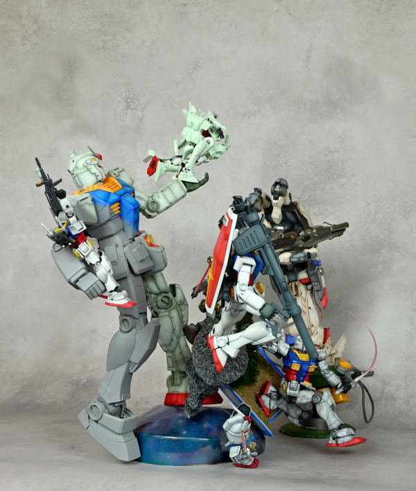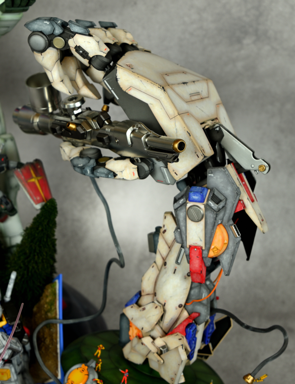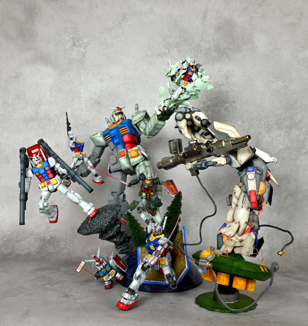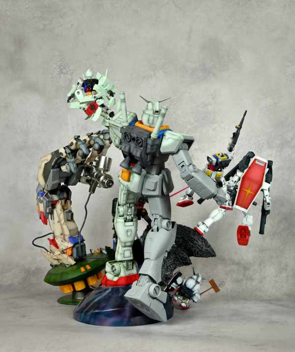 様々なRX-78-2を使用してガンプラの進化、ガンダムの軌跡を表現しました。巨大なマニピュレーターとハンドピースでガンダムの記念像を製作してるイメージです。各グレードそれぞれ違う塗装で仕上げました。最初のガンプラの殻を破って最新のガンプラが姿を現す表現、マニピュレーターの造形にこだわりました!