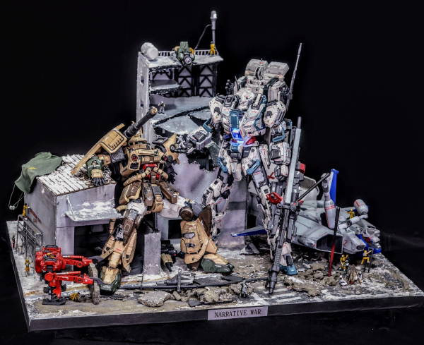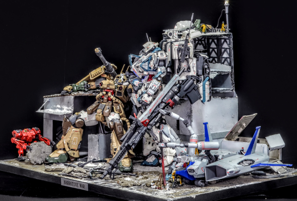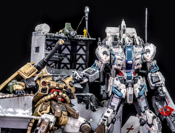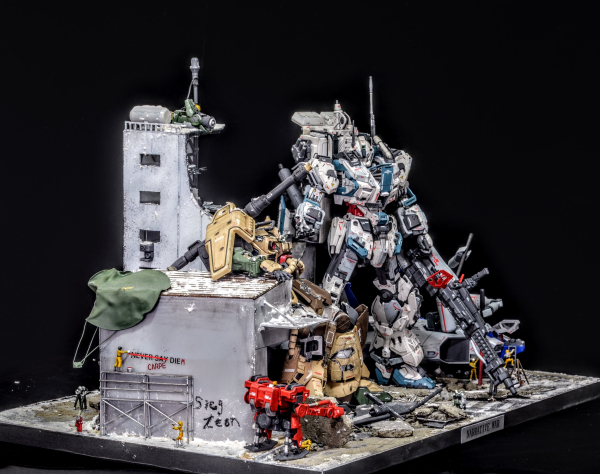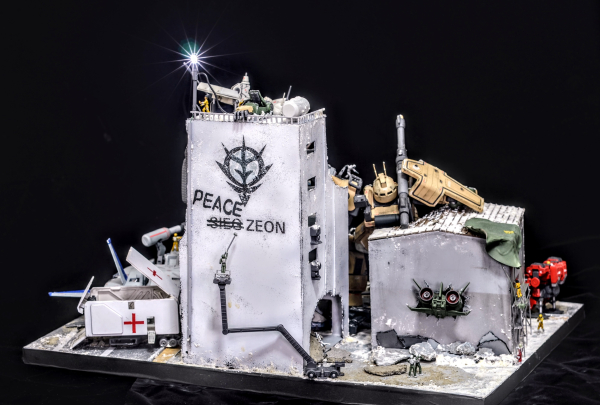 冬の市街地でのMS戦後、敵同士ながら互いに助け合う兵士達の情景を表現しました。熱せられたMS用ライフルのバレルで暖を取る者や瓦礫の中から花を見つける者、残骸を使い照明を灯す者、医療コンテナで敵味方問わず手当を受ける情景など、360°どこから見ても新たな発見がある、ワクワクする作品に仕上げました。