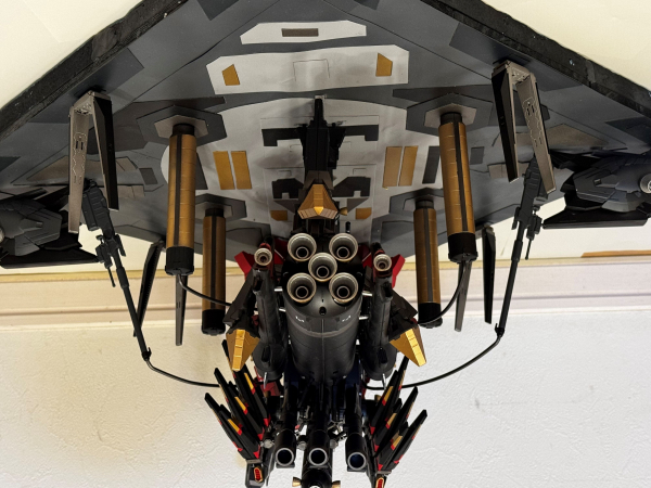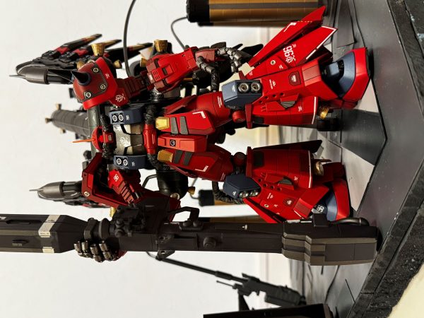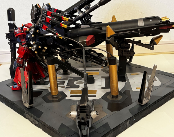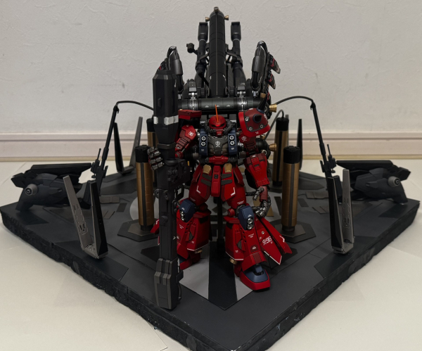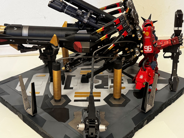 フルアーマーガンダムに対抗するために、資源も少なくあり合わせのもので急な製造をしたサイコザクでとは違う、時間と資源があり、あり合わせだけじゃないもので作られたサイコザクの発進を、45㎝×45㎝のジオラマと合わせてイメージして作りました。サイコザクはスジボリや色分けなどで細かくやりすぎない程度にディティールアップをしました。また腕にサイコミュ搭載の腕部をつけ、他のさまざまなところに追加装備、装甲を取り付けることであり合わせではないサイコザクを作りました。ジオラマはプラバンの切り貼りでデザインをより良くするのと、ガンプラの組み合わせなどで作ったエネルギーコードにつなげたままにしたりエネルギータンクを近くに置いておくことで発信し始めという印象を受けることができるようにしましたこだわったところはよりサイコザクを大きく力強く感じてもらうために大型のタンクにより推進をするための装備を付けたことや、全体的に大きく見せるパーツをミキシングをしたことです。初めての大型のジオラマ制作でしたが迫力やジオラマ、サイコザクのデザインを楽しんでみてもらえると幸いです。