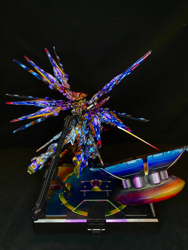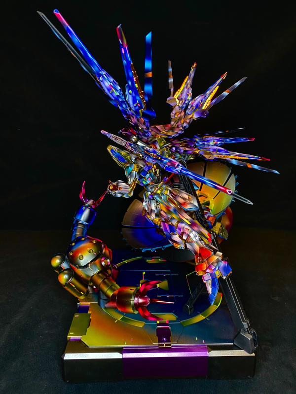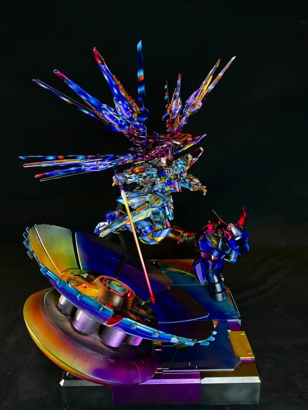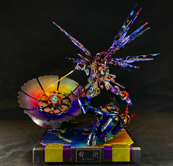 《Rival》是一件以雙機對峙為主軸的敘事性模型作品,描繪兩台宿命之敵於戰場焦點交會的瞬間。一場不為勝負、只為信念的對決在此凝結,透過構圖與光影,將情感張力定格在觀者眼前。 本作全面採用 NMM(Non-Metallic Metal)非金屬金屬技法,以筆觸層層堆疊出金屬質感與方向性光源,捨棄真實金屬漆的反射效果,轉而以對比與冷暖調和營造畫面節奏。為加強整體戲劇性與視覺引導,作品進一步導入 OSL(Object Source Lighting)發光源描繪技法,並設定雙重主光源:其一為主角機體揮舞的光束軍刀,其二為兩機體眼部的自發光感應器。 光束軍刀釋出的強光自右上方劃出,染亮敵機肩甲與上半身,同時製造出斜向陰影,使主視覺軸線自然導向交戰核心。相對地,眼部光源則為冷色調點光源,茲寇克則是眼部發紅色光芒,形成補光與對峙效果。雙光源不僅豐富了畫面層次,也象徵了意志與感知的碰撞——一為攻擊的火焰,一為洞察的目光。 場景構圖則刻意採取動態對角線布局,雙機一高一低、一進一守,形成張力與不穩定感,像是一場即將爆發的終章決鬥。細節方面,除了光影描繪與塗裝控制,亦輔以破損構件、飛濺灰燼與焦痕表現場景真實性,並透過控制飽和度與銳利邊緣,將焦點集中於動作核心。 《Rival》嘗試在模型靜態展示與動畫分鏡之間找到一種平衡,讓一張定格畫面講述一段未完的故事。它不強調華麗的裝飾,而專注於敘事節奏與衝突瞬間的重量。