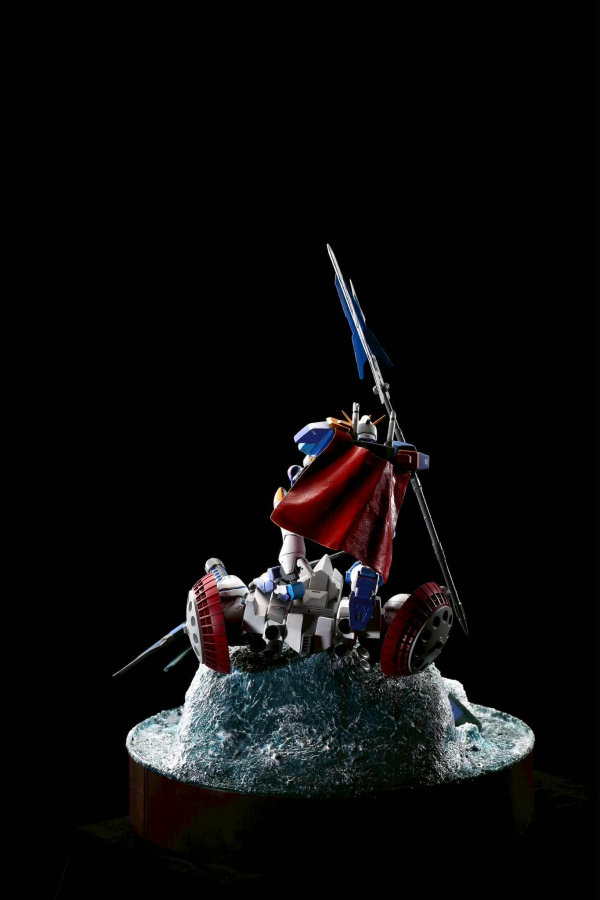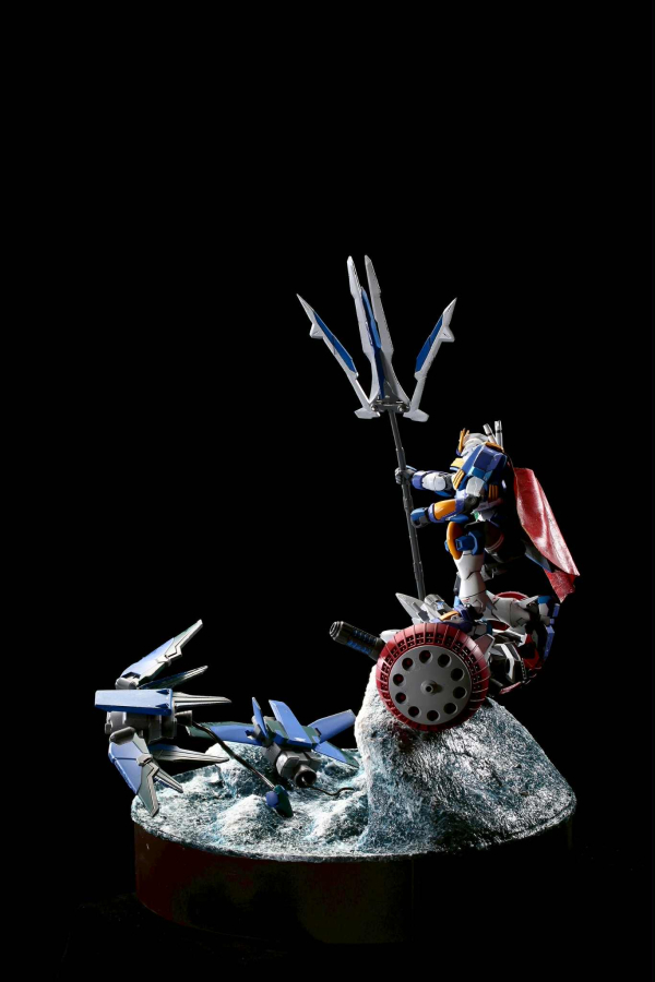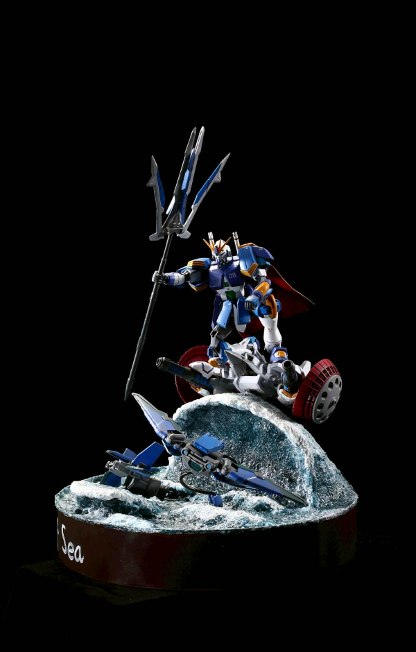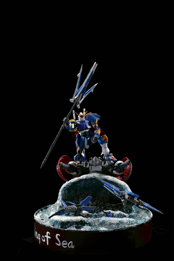 《水神鋼彈》創作理念 本作品靈感源自「水上戰士到水神」的傳說。作品的核心精神在於 「鍛鍊、試煉、蛻變」。在遠古的意象裡,年輕的戰士歷經無數次被巨浪擊倒、冰河試煉的歷程,最終理解水的柔韌與力量,從「以力抗水」蛻變為「與水同心」,終成水神。這段過程正是本鋼彈造型設計的靈感來源。 設計理念配色規劃 • 以 深藍、冰白、湖綠 為主色,代表河川、冰雪與生命泉源。 • 點綴金色線條,象徵「神格化」後的尊榮與神聖。武裝設計 • 「三叉戟」:主武器為能切開巨浪的長劍,劍刃帶有透明藍色效果件,如同水流凝結成型。精神內涵 水神鋼彈不是以「征服」為目的,而是以「守護」為使命。它承載著「柔能克剛、滴水穿石」的哲理,提醒人們力量並非只在強硬,而在於持續與堅韌。總《水神鋼彈》不僅是一台戰鬥機體,更是一段故事的延伸 —— 從無數試煉中誕生的守護者,象徵著勇者與自然的融合。它的存在,讓人重新省思人與大地、力量與柔性的平衡〜