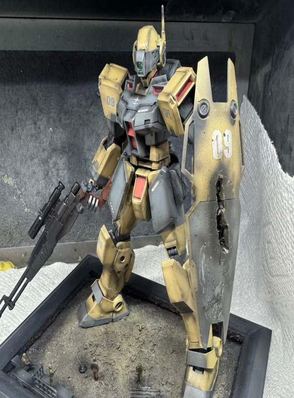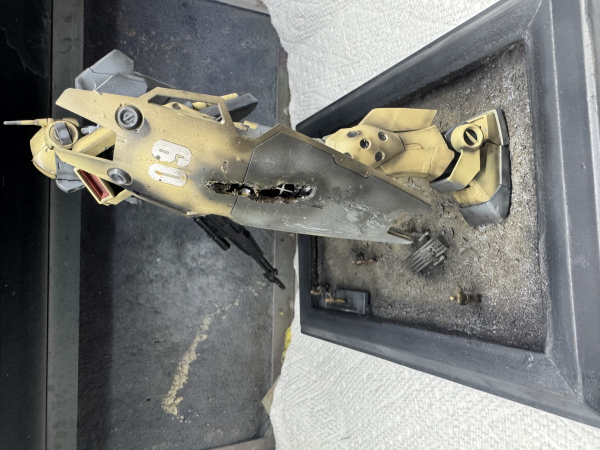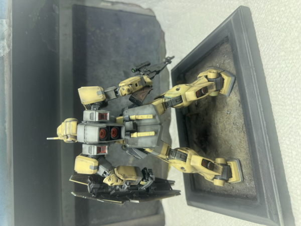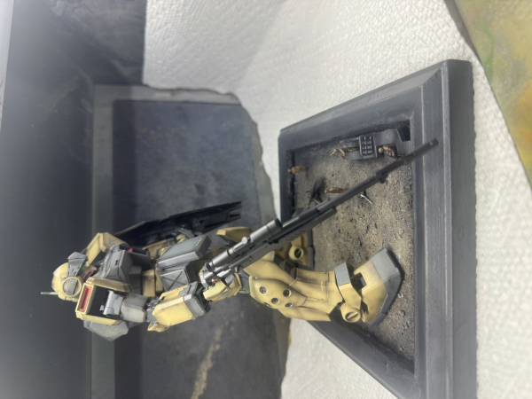 In the area of Wisconsin that I am from it is very common for people to be into hunting something that I I felt I really wanted to show in this kid to show where it's from therefore I designed the mobile suit to look like a hunter using neon orange gray and a combination of beige I feel that this really shows where it came from and tell sort of a story combined with the people on the bottom working on it I think it really shows where it came from I painted it using spray can and Gundam marker in an airbrush I then use mud mixed with water to create the base inside of an old picture frame and used various parts from old ship model kits in order to achieve the materials on the ground