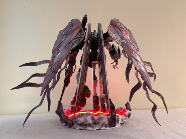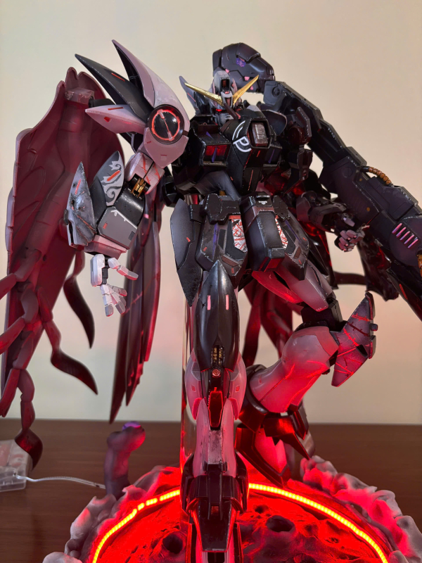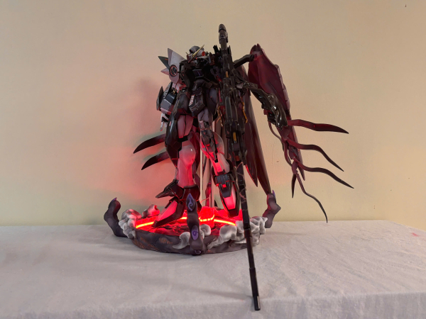 Inspired by the Gundam Wing anime, imagine a prototype copied from Earth Federation technology and secretly created by the Oz organization: a Gundam called Wing Rose Repair II, designed to counter Earth Federation pilots. The scene depicts a heavily modified Wing Rose Gundam invading the Moon. This custom machine, inspired by the Gundam Wing style but with redesigned limbs and head, carries a sentient heavy weapon. Notably, one side of its head is equipped with a radar capable of detecting other mobile suits within a 1km radius. When the Moon is invaded by a mysterious symbiotic life form, Wing Rose is assigned to the invasion mission. During the mission, this symbiotic entity appears and fuses with the Gundam and its heavy weapon, taking over part of its body. The Gundam possesses an alluring crimson color, but also has a dark, gloomy color like a rose. Ultimately, the Earth Federation achieved victory in the war, while the duplicated Gundams proved unsuccessful. Original coupled with improvement, will ensure success.