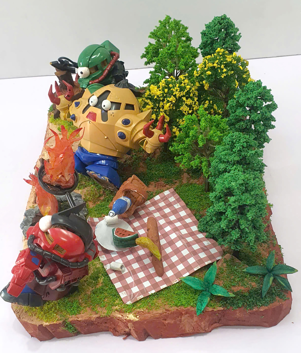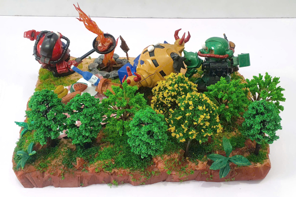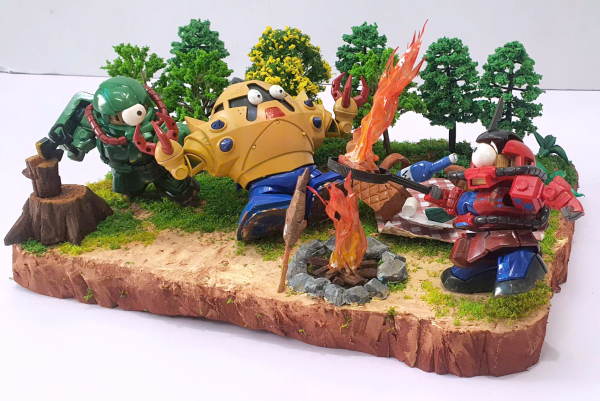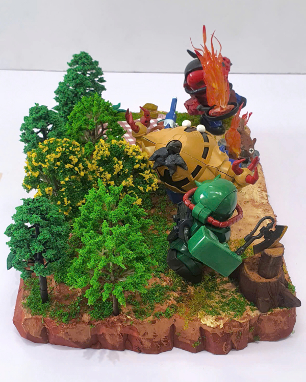 em sử dụng Zock và 2 zaku trong bộ SD BB SENSHI MOBILE SUIT GUNDAM PRINCIPALITY OF ZEON MOBILE SUIT SET, mặt nền được làm từ: xốp , keo sữa, bột cỏ, em đã tạo hình khúc cây và các vật dụng khác từ xốp rồi sau đó tô màu sơn acrylic lên, lửa được làm từ bìa nhựa trong, hơ nóng sau đó tạo hình và sơn màu lên