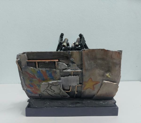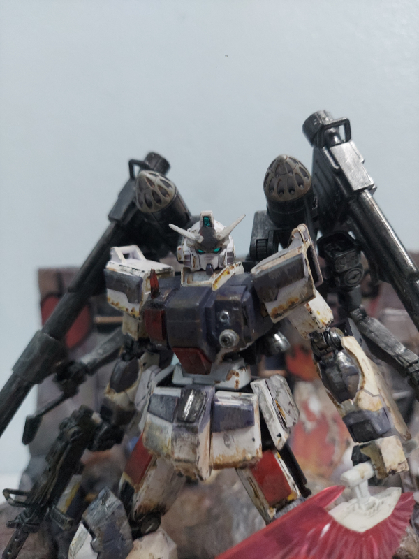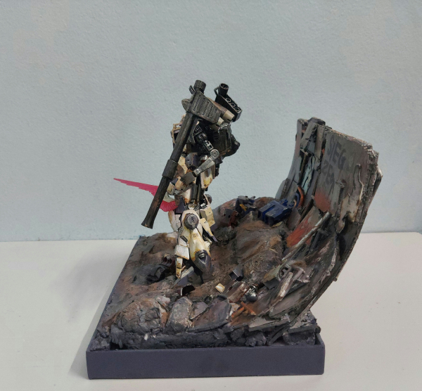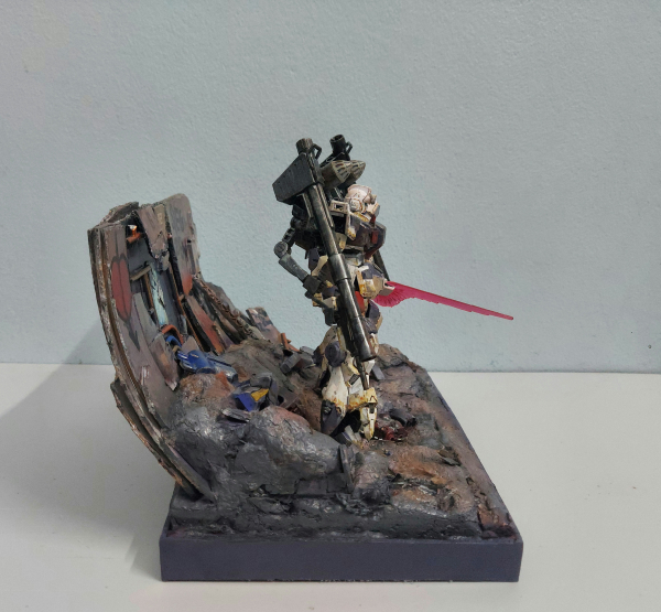 Trước hết tôi thực hiện chế tạo một cái diorama với xốp, và các miếng plastic plate với một số bộ phận Gundam rồi sơn lại bằng màu acrylic. Tôi thực hiện kitbash hg ground type gundam với hg moon Gundam, cũng như trang bị thêm phần tay phụ cầm bazooka và 2 ụ phóng tên lửa đã được tùy chỉnh sử dụng plastic plate và putty rồi sơn với tông màu tím và trắng cũng như weathering toàn bộ mẫu mô hình.